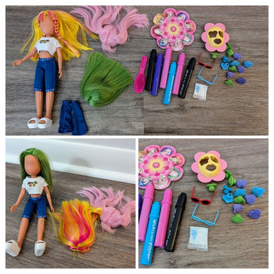 "What's Her Face" Doll with 3 wigs & accessories includes velcro wigs, stamps to make faces, various accessories Dolls and Accessories