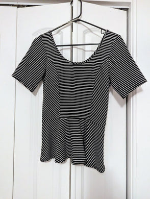 "Eyelash Couture" Women's Peplum Shirt Women's short sleeve peplum shirt, Small, black with white stripe Women's - S