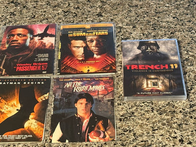5 movies tench 11 in org case rest in plastic sleeve: pass 57, sum of all fear, Batman begins, all right moves Movies- Regular price