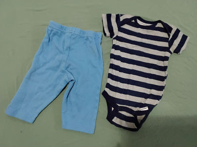 1 outfit-size 0-3mo blue pants and dark blue/gray stripped onesie Newborn