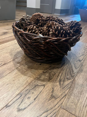 1 large dark brown wicker basket w/ pinecones Round wicker basket 12 inches in diameter- Regular price