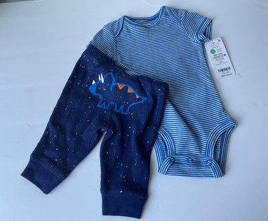 NWT - Carters - 2 pc - white & blue stripped onsie & blue pants with dinosaur on back 3 Months