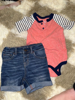Cat and Jack jean shorts and heathered red and navy onesie 18 Months