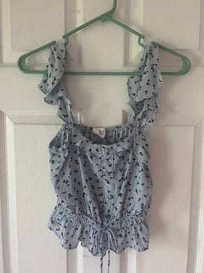 Sienna So, blue floral top, size XS, SMR Tie at bottom, ruffle sleeves, EUC Women's - XS