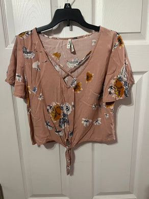 MUDD, size XS, rose pink blouse, v neck with Criss cross detail, flutter sleeves, tie front, SMR Women's - XS- Regular price