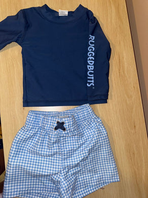 Rugged Butts size 6-12 navy swim top and blue plaid swim shorts 9 Months