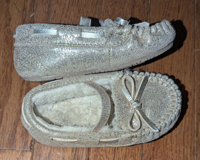 Glitter tan moccasins w bow accents and strap Rubber sole. Faux fur lined 6 (Toddler)- Regular price