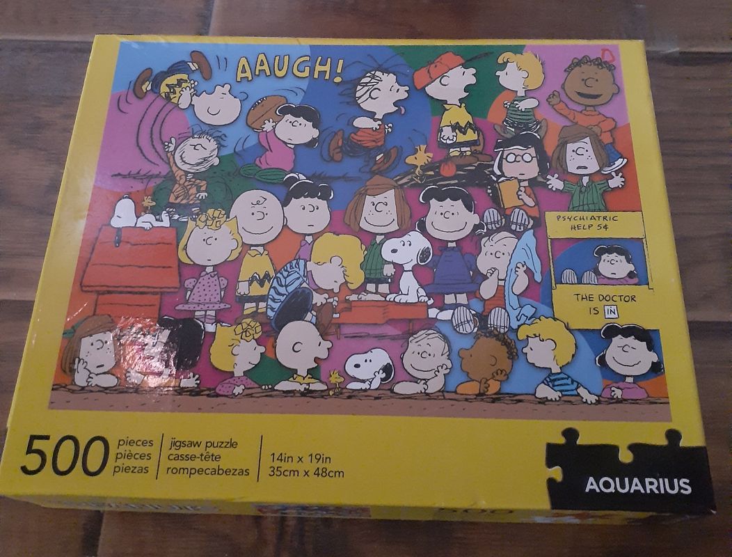 3pc Peanuts lot metal can with lid, 500pc puzzle and Linus 8" plush doll